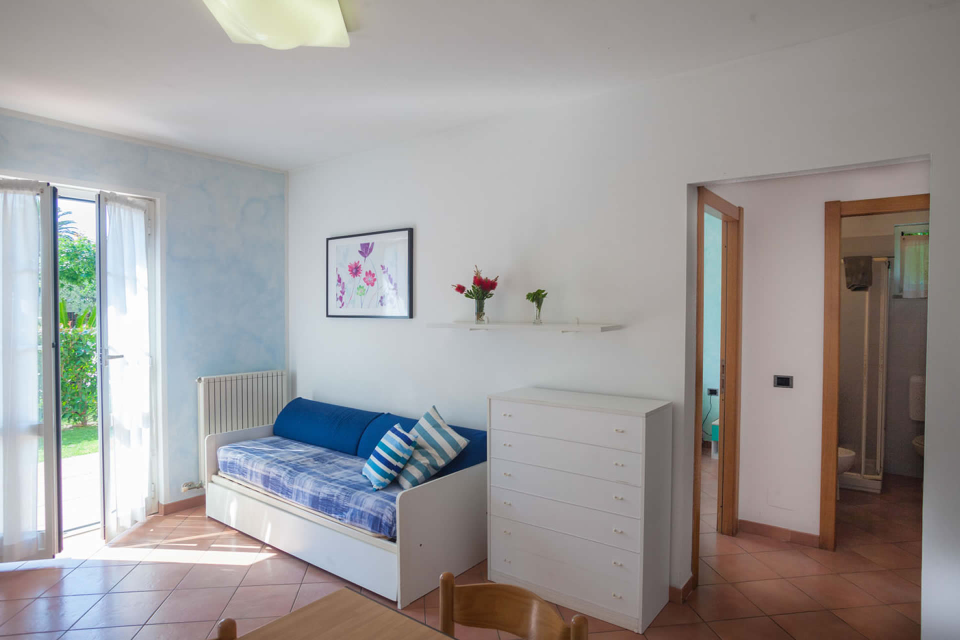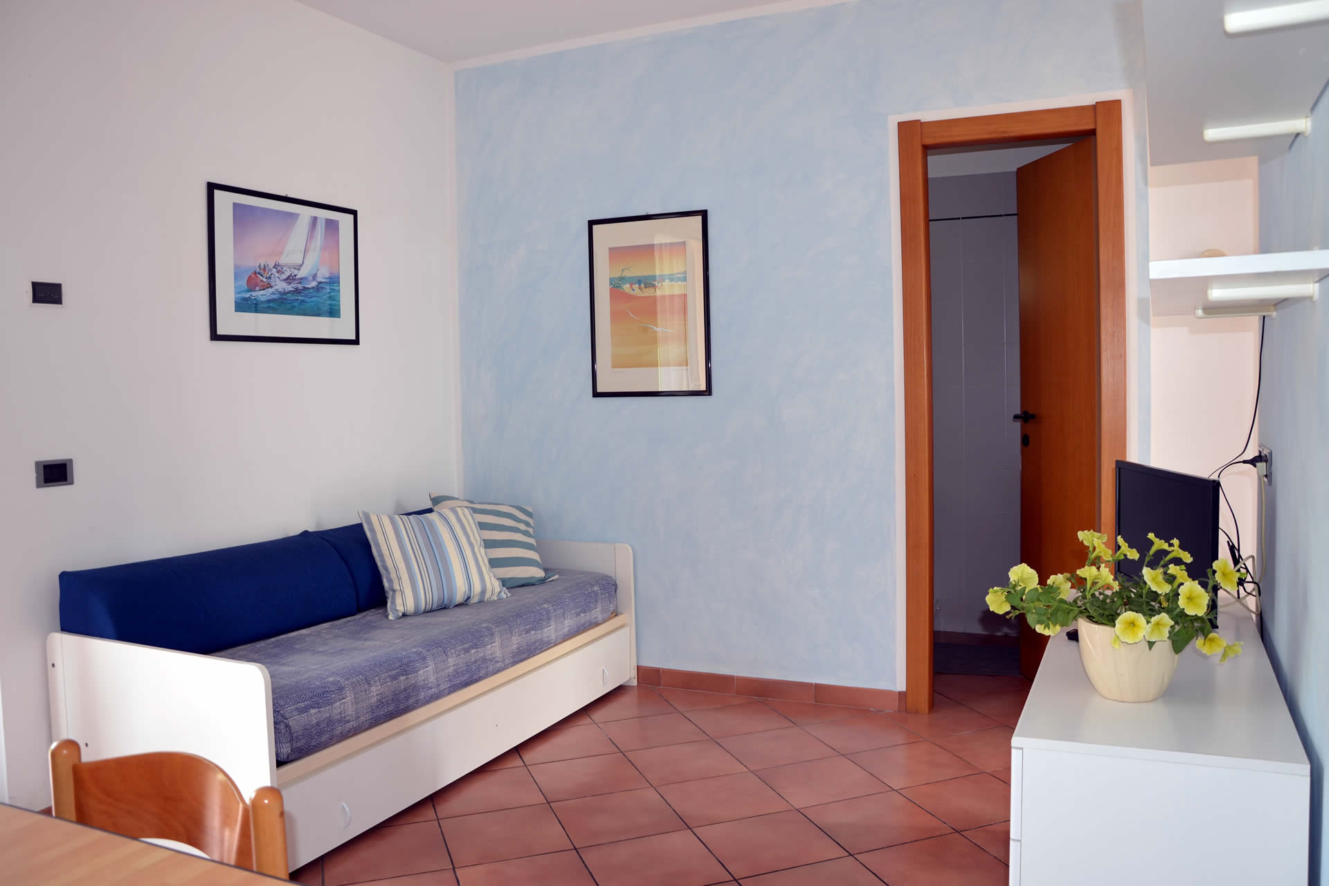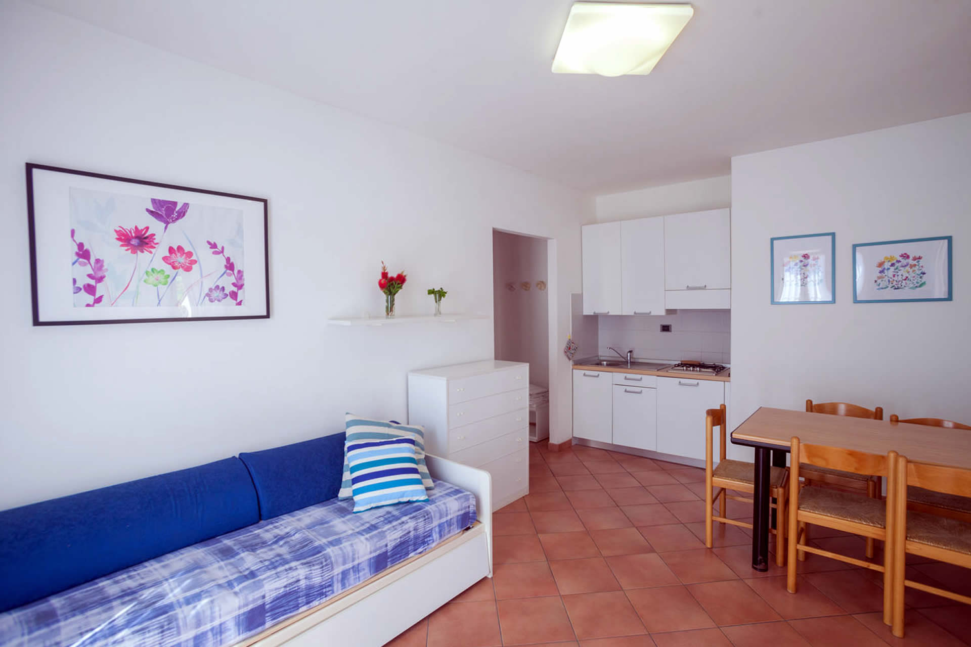 Appartamento composto da camera matrimoniale, zona soggiorno con angolo cottura completamente arredato, divano letto estraibile, bagno con doccia.